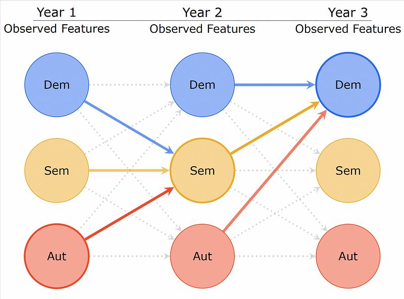 UNITAS models regime types as a sequential process, where classification in each year incorporates information from observable indicators and the historical trajectory of the political system.