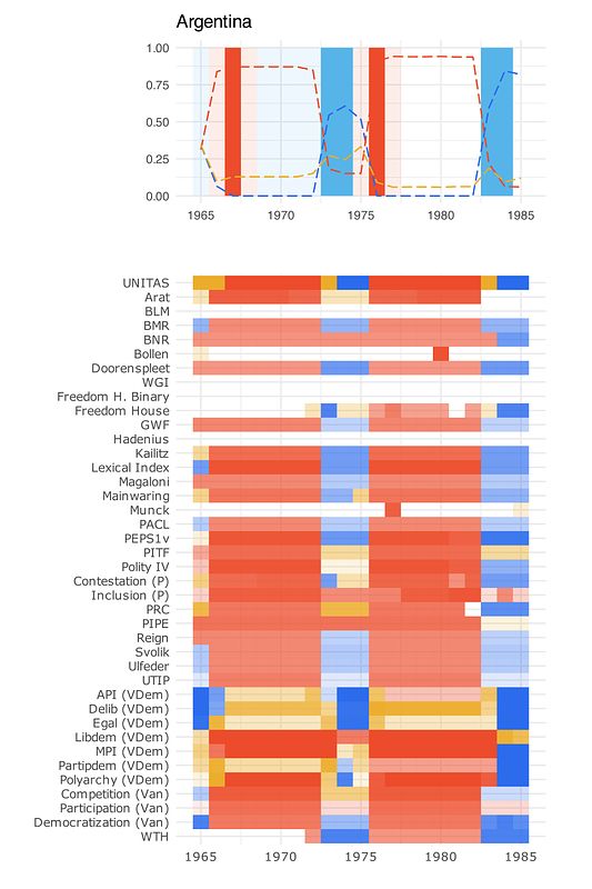 The figures below show Thailand (1980–2000) and Argentina (1965–1985). Bottom panels display classifications from individual regime indicators; top panels show UNITAS probability estimates and identified transitions. Note how UNITAS synthesizes disagreement among indicators: Thailand's 1991 coup registers as increased uncertainty rather than a full regime change, while Argentina's 1976 coup shows clear consensus supporting an autocratic transition.